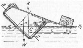 ВЛ – ватерлиния до накренивания судна; В1 Л1 – ватерлиния после накренивания судна; W – вес судна; С – центр погруженного объема; Р – вес насыпного груза