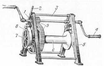 1 – подшипник; 2 – рукоятка тормоза; 3 – штанги-болты; 4 – рукоятка; 5 – рама; 6 – вал; 7 – чугунное колесо ленточного тормоза; 8 – ленточный тормоз; 9 – зубчатая передача