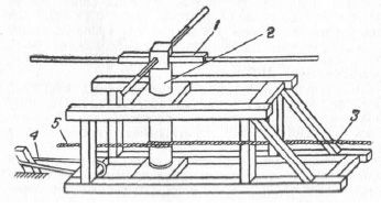 1 – вымбовка; 2 – барабан; 3 – рабочий конец троса; 4 – крепление ворота; 5 – свободный конец троса