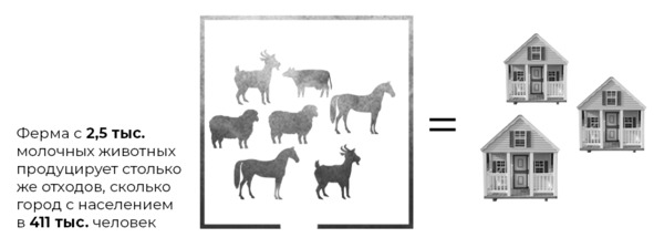 Агентство по охране окружающей среды США подсчитало, что ферма с 2,5 тыс. молочных животных продуцирует столько же отходов, сколько город с населением в 411 тыс. человек.