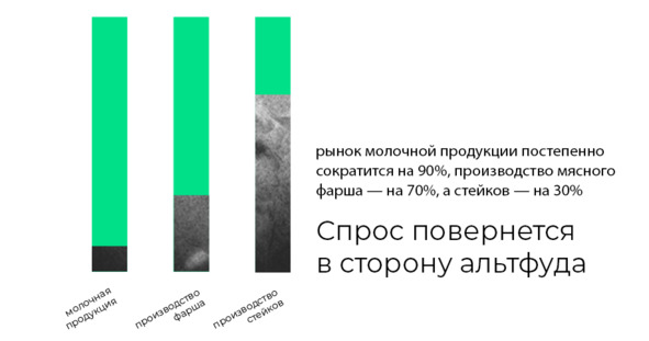 В перспективе все это приведет к смещению акцентов: рынок молочной продукции постепенно сократится на 90%, производство мясного фарша – на 70%, а стейков – на 30%. Спрос повернется в сторону альтфуда.