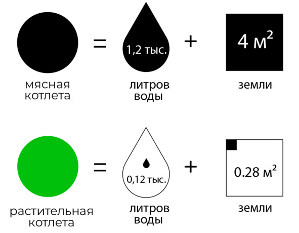 А на производство мясной котлеты нужно около 1,2 тыс. литров воды и 4 м² земли. Для растительных аналогов требуется на 99% меньше воды, на 93% меньше земли и на 46% меньше электроэнергии. При этом выброс парниковых газов будет ниже на 90%.