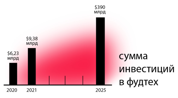 Лишь за первый квартал 2021 года сумма инвестиций в фудтех увеличилась до $9,38 млрд – это на 30% больше, чем за аналогичный период 2020 года, а к 2025 году объем мировой foodtech-индустрии составит порядка $390 млрд.