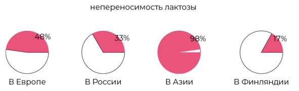 Согласно исследованию компании Genotek, лактозу не переносят 48% европейцев, а каждый третий россиянин не может потреблять молочный сахар. Для сравнения, на юго-востоке Азии лактоза не усваивается почти у 98% жителей, а в Финляндии только у 17% населения.
