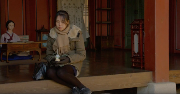 Режиссер входит в художественную мастерскую («Прямо сейчас, а не после», 2015). Рядом с географической картой висит афиша KIAF за 2014 год. KIAF – ежегодная Корейская художественная выставка, одна из крупнейших в Азии. Можно начать гадать, что же хотел сказать автор: начинающая художница имеет амбиции и, может быть, мечтает об участии в этой выставке? Зачем иначе помещать в кадр плакат? А можно не увлекаться анализом. Просто плакат значимого события культурной жизни Сеула, просто висит.