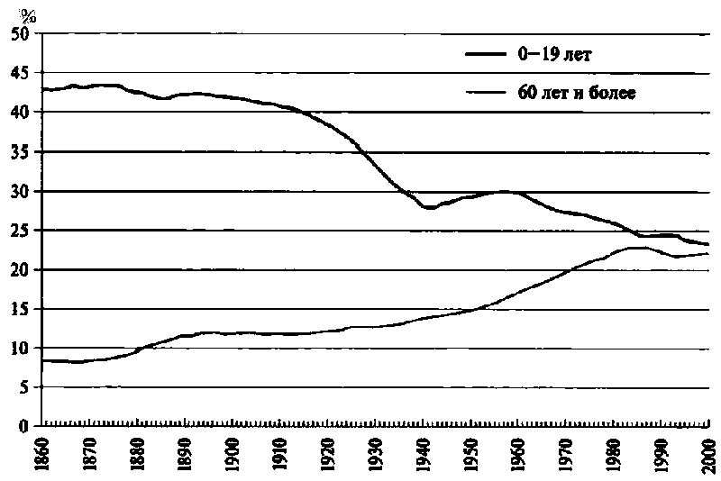 Вторая половина XX в. ознаменовалась заметным постарением населения большинства развитых стран, о чем свидетельствуют как изменение долей младшей и старшей возрастных групп в их населении, так и значительное повышение его медианного возраста. В 2000 г. в Европе в целом половина населения была старше 37,6 года, в Северной Америке – старше 35,4 года; в 1950 г. население этих регионов было намного моложе.