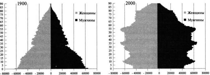 Новая возрастная структура – неизбежное следствие перехода к низкой смертности и низкой рождаемости: на смену классической возрастной пирамиде с широким основанием, быстро сужающейся кверху (поколение родившихся быстро вымирает) приходит фигура, которая может называться пирамидой лишь условно (почти все родившиеся доживают до весьма почтенных возрастов). Это означает, что доля младших возрастных групп в населении неуклонно снижается, а доля старших столь же неуклонно возрастает, население «стареет». В XX в. старение дало о себе знать прежде всего в экономически развитых странах. Его можно проиллюстрировать на примере Швеции – страны, не участвовавшей в военных действиях, которые в той или иной степени деформировали возрастную пирамиду большинства европейских стран.