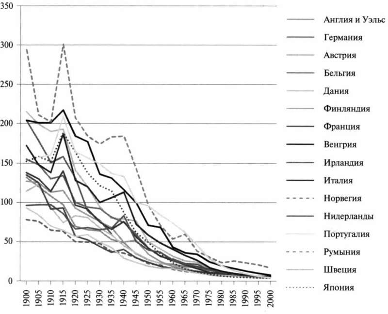 Младенческая смертность в некоторых европейских странах и Японии. Исходный уровень к началу и снижение к концу XX века.