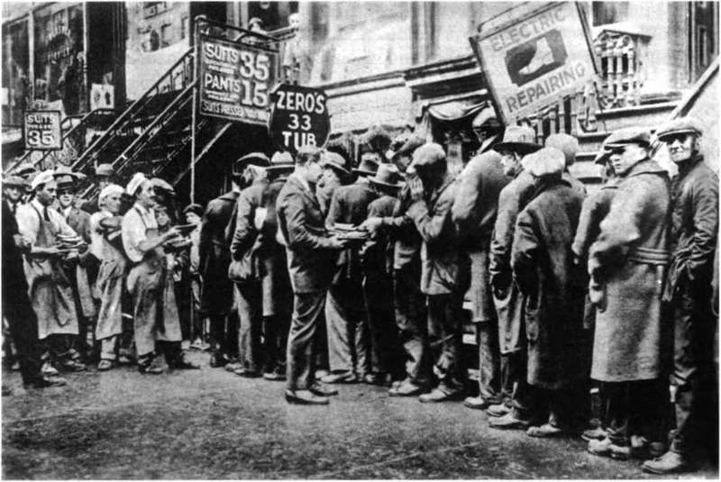 Очередь безработных у пункта раздачи пищи. США, 1930 г. РГАКФД