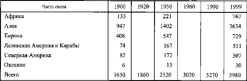 В 1900 г. на Земле обитали 1650 млн человек, в 1920 г. – 1860 млн; в 1950 г. это число увеличилось до 2,5 млрд, в 1960 г. – до 3 млрд, в 1990 г. – до 5,3 млрд, а в 2000 г. – до 6,1 млрд (см. табл.). Но произошел не просто взрывной численный рост населения, но и существенное изменение его размещения.