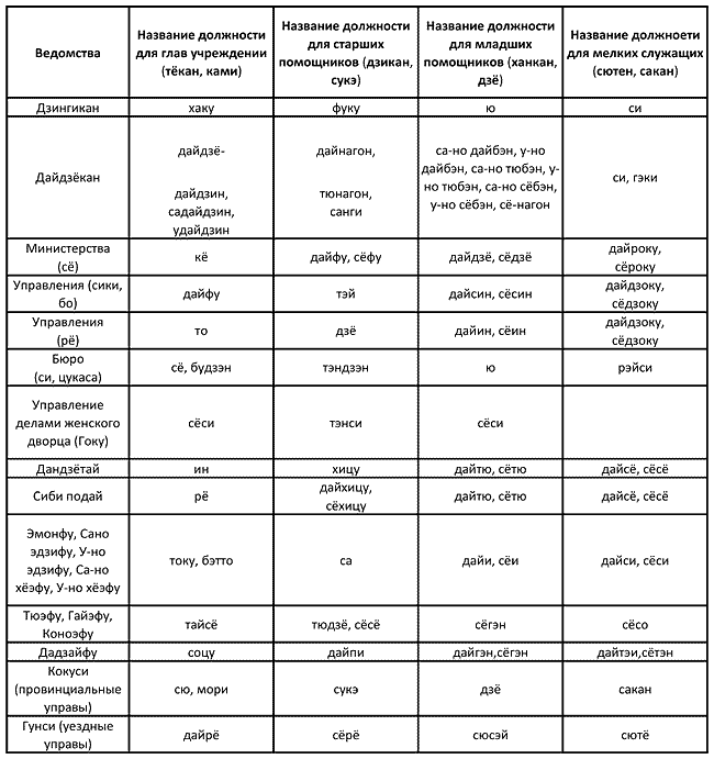 Согласно кодексу «Тайхорё», все чиновники в соответствии с занимаемой должностью были причислены к одному из четырех больших разрядов: «тёкан» или «ками», «дзикан» или «сукэ», «ханкан» или «дзё» и «сютэн» или «сакан». Разряд «тёкан» (досл. «старший чин») включал в себя всех чиновников, которые занимали высшие посты в соответствующих учреждениях, будь то «палаты» (Дзингикан, Дайдзёкан, Дандзётай), министерства (яп. сё), ведомства (Сиби тюдай), различные управления (яп. рё, сики, бо), бюро (яп. си, цукаса, кэн, дзё) или управы (яп. фу). К разряду «дзикан» (досл. «следующие [за начальником] чины») относились все заместители руководителей соответствующих департаментов, иначе говоря, ближайшие помощники «начальников». К разряду «ханкан» причислялись все остальные помощники глав ведомств. Что же касается «сютэн», то к этому разряду были отнесены все мелкие ведомственные чиновники, как, например, писцы.