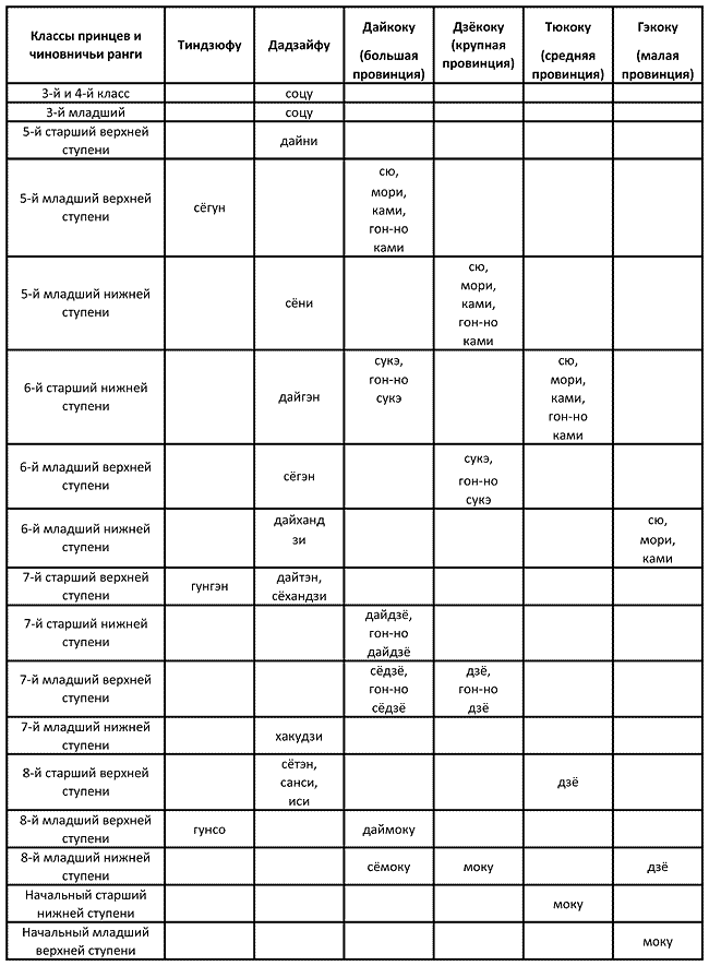 Соответствия между рангом и должностью в местном аппарате управления (период Хэйан).