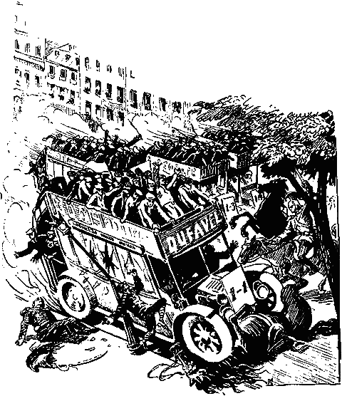 Но сзади нас толпа была уже увлечена, захвачена. Она бежала за автобусами, между ними, цеплялась за железные прутья, висела на перилах, наполняла карету внутри, даже взлезла на империал и гудела в тон цилиндрам. В каждом автобусе был полный комплект пассажиров, делавший его еще значительнее изнутри; снаружи каждый из них был весь облеплен людьми. Вы можете себе представить, как они соединяли ряд с рядом, один конец колонны с другим, как заполнили все промежутки и все стояли между собою.