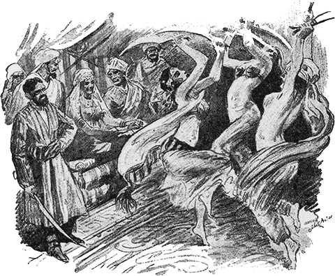 В зал вошли медленные пары танцовщиц. В их руках были отточенные кривые ятаганы и, кружась, одна за другой, они размахивали оружием и широкие полосы от взмахов блестящей стали сумрачно блестели среди белой дымки кисеи, которая вилась в воздухе за танцующими.