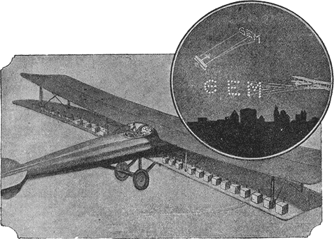 Большой успех имеет в Америке воздушная реклама при помощи струй дыма или светящегося следа, которые летчик оставляет за собой, выписывая своим аэропланом елые буквы и слова, при чем от него требуется исключительная ловкость в маневрировании и проделывании ряда «мертвых петель».