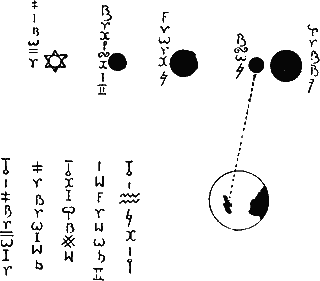 – Да. Сверху, на одной линии слева направо изображены: Солнце, Меркурий, Венера, Луна и Земля. Пунктир от Луны (как раз от того места, где начинается кратер Коноп!?) на большой рисунок внизу, где изображена восточная часть Земли, – путь посланного снаряда. Он кончается у продолговатого пятна, своими очертаниями напоминающего Урмийское озеро; второе пятно рядом – Каспийское море. Расшифровать надпись на левой стороне документа после всего этого оказалось чрезвычайно легко. Рисунки планет объяснили нам надписи над ними, и нам, таким образом, стало известно пять слов. Обратите внимание – в надписи слева встречаются те же буквы, что и над рисунками. Это целиком разрешает задачу. Вот что говорит эта надпись: