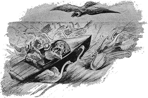 На третий день они достигли высоты города Дильмана, с тем же усердием продолжая работу. В полдень они неожиданно наткнулись на громадное стадо диких лебедей, спасающихся от какой-то хищной птицы. Стадо, в паническом ужасе, плыло прямо к лодке. Преследующий стадо хищник в это время стал опускаться и, сделав большой круг, повис над лебедями.