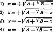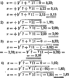 «Итерация» заключается в следующем: Взяв одно из этих выражений, мы полагаем в правой части его х=0; получаем некоторое значение для «х» в левой части равенства. Это значение берем для «х» в правой части; для левой части получаем новое значение «х» и т. д. до совпадения двух соседних значений «х» с достаточной точностью.