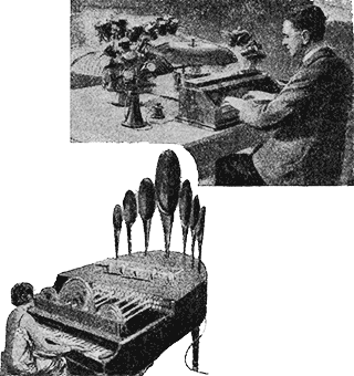 О сочетании в одном инструменте света и музыки мы уже рассказывали нашим читателям в № 6 «Мира Приключений» за 1925 год. Над этой заманчивой идеей работают теперь многие изобретатели и в том числе нашумевший в прошлом году своими «лучами смерти» английский физик Гриндель Мэтьюс. Этот новый аппарат, названный им, «люминофоном», первоначальное устройство которого видно на рисунке, основан на свойстве светового луча изменять электрическое сопротивление одного вещества – селена. Аппарат состоит из небольшой клавиатуры и двух быстро вращающихся дисков с многочисленными отверстиями. Над этими дисками установлено несколько рядов небольших ламп, свет коих падает сквозь мелькающие прорезы дисков на особый электрический селеновый элемент. Через этот элемент пропускают электрический ток, который идет затем в лампы-усилители (как и у радио) и превращается громкоговорителями в звуки и тона.