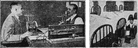 Такие наблюдения производятся в одном американском институте, где при помощи очень сильных аппаратов (один из них изображен на левом рисунке) измеряется и автоматически записывается малейшее движение, вздох и удар пульса спящего человека, после той или иной работы. Испытательная «сонная» лаборатория изображена на рисунке справа. Может быть читатели вспомнят фантастический рассказ «Машина сновидений» в № 3 «Мира Приключений» за 1925 г.