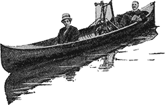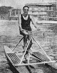 Вот, например, фотография нового водяного велосипеда, пользующегося большим успехом среди американских спортсменов. Обычный велосипед установлен на стальной раме с поплавками и приводит в движение подводный винт, позволяя двигаться со скоростью 10–15 верст в час. Для пожилых любителей водного спорта очень удобна лодка, изображенная на другом рисунке: человек, едущий на ней, полулежит и нажимает педали, связанные особым приводом с небольшим винтом у кормы.
