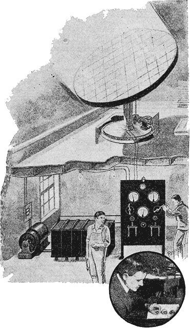 На нашем рисунке (внизу) изображен сам Кобленц во время работы в своей лаборатории, а наверху – проект солнечной электрической машины, которая быть может завтра станет реальностью. Эта машина будет тогда иметь вид широкого диска, покрытого многочисленными ячейками с молибденитом, от которых электрические провода будут идти для зарядки электрических аккумуляторов, энергией которых можно будет пользоваться в темное время суток.
