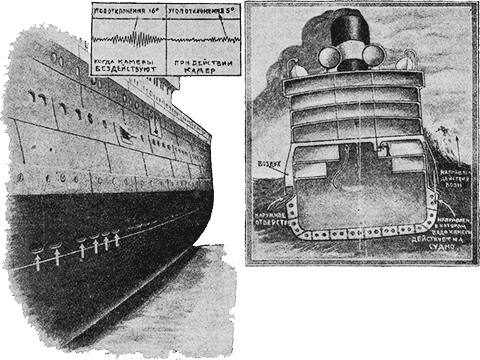 Слева мы даем общий вид парохода, снабженного такими воздушно-водяными камерами. Наверху слева – диаграмма колебаний судна. Справа – в разрезе видно простое в сущности устройство воздушных камер и кранов.