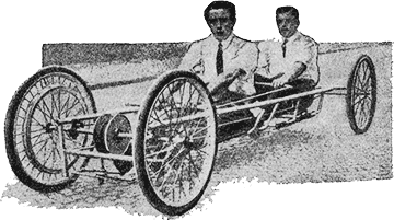 Интересной попыткой сочетать в одно целое быстроту автомобиля и легкость, и дешевизну велосипеда можно считать авто-вело-машину, недавно построенную Кюрри, берлинским студентом-любителем, и изображенную на нашем снимке. Это – легкая, из дюраллюминия, низкая тележка на 4 велосипедных колесах, вращаемых двумя седоками при помощи ручного и ножного привода, как на железнодорожной дрезине.