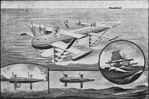 В американских технических журналах появилось описание гигантского скользящего гидроплана, предназначенного для океанских рейсов между Америкой и Европой. Гидроплан этот будет представлять собою длинный веретенообразный корпус с помещениями для нескольких десятков пассажиров, команды, служебными отделениями, радио, кладовыми для багажа и припасов, уборными и ванными.