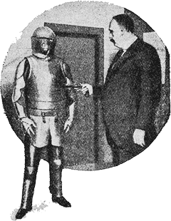 При взгляде на этот снимок читатель, наверно, скажет, что на нем изображен какой то средневековый рыцарь в своих тяжелых, стальных доспехах. Иллюзию портит современная фигура слева с револьвером в руке.