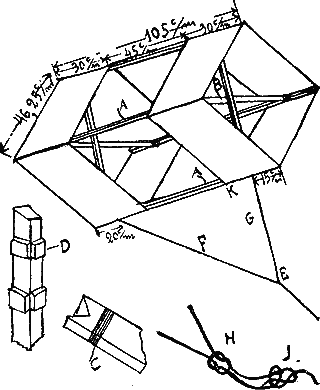 Если змей летает на легком ветру, то закрепляют узел E так, чтобы G уздечки укоротилось, а F удлинилось; при сильном ветре наоборот. При очень сильном ветре лучше совсем не употреблять уздечки, а прикреплять поводовую веревку прямо к бруску у K.