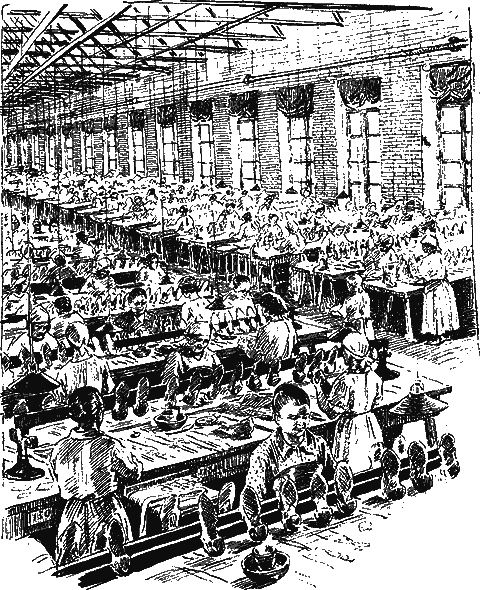 Однажды я зашел в галошное отделение… Вы можете посмотреть это отделение и на «Красном Треугольнике». Здесь оно состоит из целого ряда огромных помещений, где каждая из женщин армии труда делает свое отдельное дело.