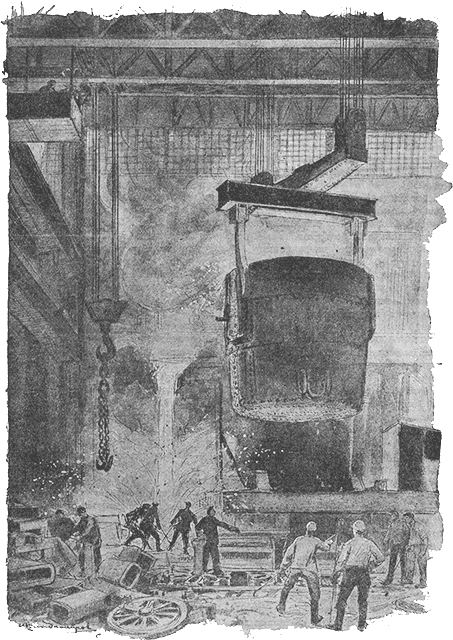 Воздушное чудовище приподымает ковш за цапфы и переносит к изложницам (формам).