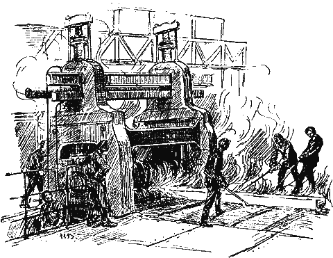 Отчаянно свистят паровички, перетаскивая поезда груженых вагонеток, лязгают цепи, гремят лебедки, грохочут гиганты-молоты, беснуется в печах пламя и расплавленный металл. Одиннадцатитысячная армия рабочих рассыпана на территории завода. Одиннадцать тысяч пар рук, с утра до вечера, льют, топят, куют, прокатывают и перекидывают с места на место глыбы металла.
