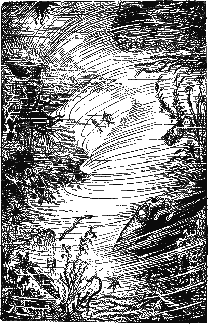 Он быстрым движением отодвинул в сторону несколько рычагов и выключил электрическую энергию. Тихий шум машин совершенно замолк. Жизнь «Кракона» остановилась. В то же мгновение манометр помчался кверху. Стрелка компаса резко отклонилась. Она, бешено прыгая, описала в 50 секунд четверть круга. Измеритель давления вскочил в одну минуту до 610 атмосфер. Водоворот ожесточенно всасывал лодку. «Кракон» с невероятной быстротой летел в пучину.