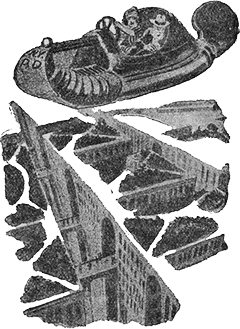И неизбежное случилось. Не зная местных законов передвижения, Пеп взяла неправильное направление и, встретив целую эскадрилью в сотню аэропланов, потеряла голову и налетела на один аэроплан. Обе машины получили серьезные повреждения и упали на землю. К счастью, ни Пеп, ни доктор не получили ушибов, но пассажир другого аэроплана был менее счастлив и сломал при падении руку.