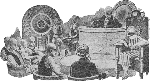 С этими словами он нажал кнопку, и в комнату, без посторонней помощи, вошло странное кресло, двигаемое, очевидно, каким-нибудь невидимым механизмом. К креслу были прикреплены всевозможные термометры и циферблаты.