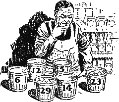 Часть этих корзин содержит куриные, часть – утиные яйца. Продавец говорит: «если я продам все яйца из этой корзины, в оставшихся яйцах на два куриных придется одно утиное яйцо». Число яиц написано на каждой корзине. Какую из них торговец должен продать, чтобы произвести свой опыт? (Ответ см. ).
