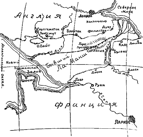 Ибо, роковым образом, первым и самым значительным результатом землетрясения 1937 года было исчезновение того древнего моря, которое англичане называли Ченнелем, а французы Ламаншем. Обмелев на семь десятых своей поверхности, оно оставило на западе только два залива, Нормандский и Бретанский, разделенные англо-нормандским полуостровом, на котором господствуют три вершины, Джерси,