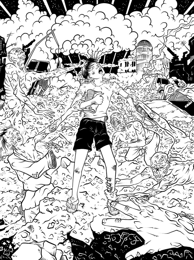 Один из призраков, увешанный лентами собственной кожи, упал рядом с Джуном, треснувшись лбом о кусок бетона, и остался лежать неподвижно. Череп лопнул, как арбуз, брошенный с высоты, толчками поползли склизкие комья мозгов. С криком Джун стал отползать, по-прежнему сжимая в руке пенал, и тут другой призрак, вылезший из обломков, поймал его за лодыжку до мяса сожженной рукой. Лицо его было комом пузыристой плоти с дырами вместо глаз и черным провалом рта.