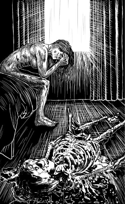 Женщина, сидевшая на краю кровати, была обнажена. Ее тело покрывали синяки и пятна засохшей крови. Она смотрела перед собой пустым взглядом, словно не замечая происходящего. Слезы текли по ее лицу, а плечи слабо вздрагивали. Тодд, смутившись, стянул с соседнего стула вязаный плед и накрыл ее.