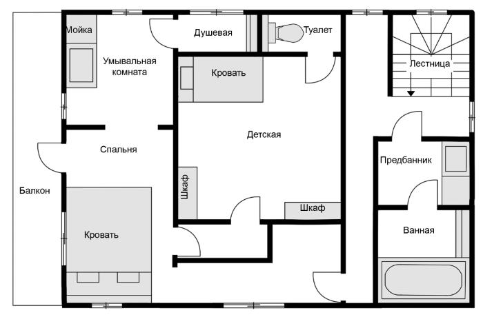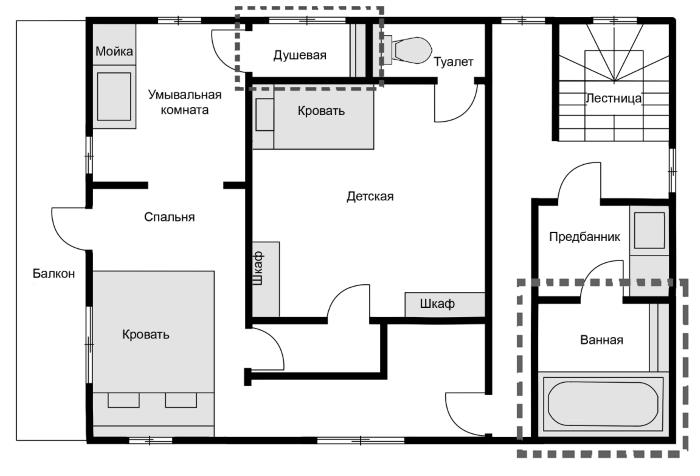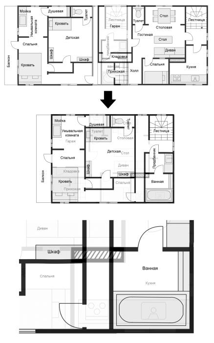 Курихара: Но, честно говоря, в ней меня тоже кое-что смущает. В верхней части плана изображена душевая. Получается, умывальная комната играет роль предбанника[29], но при этом она полностью просматривается из спальни.