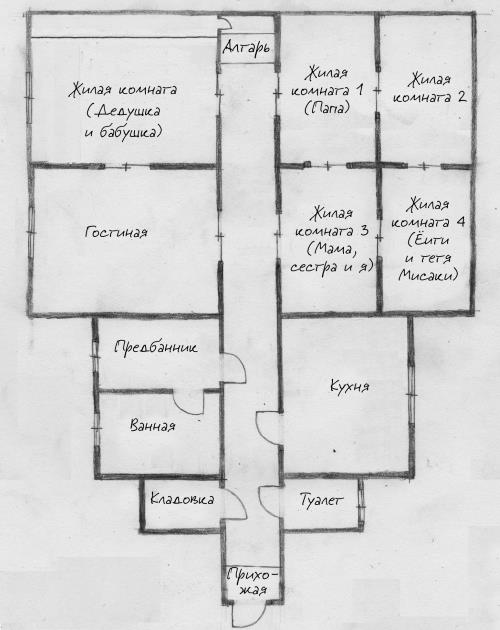 Получается, Ёити оказался в коридоре, перед алтарем, не проходя при этом через комнату, где лежала госпожа Катабути. Но как это возможно? Я стал думать над разгадкой, внимательно изучая план дома.