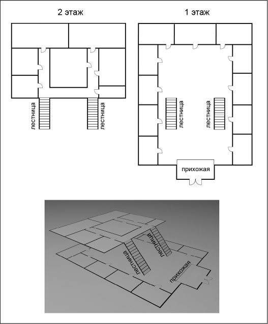 Хаясака: По обе стороны от прихожей – по лестнице. Дворецкий объяснил мне, что на первом этаже расположены комнаты для гостей и персонала, а также кухня, а сама семья живет на втором этаже.