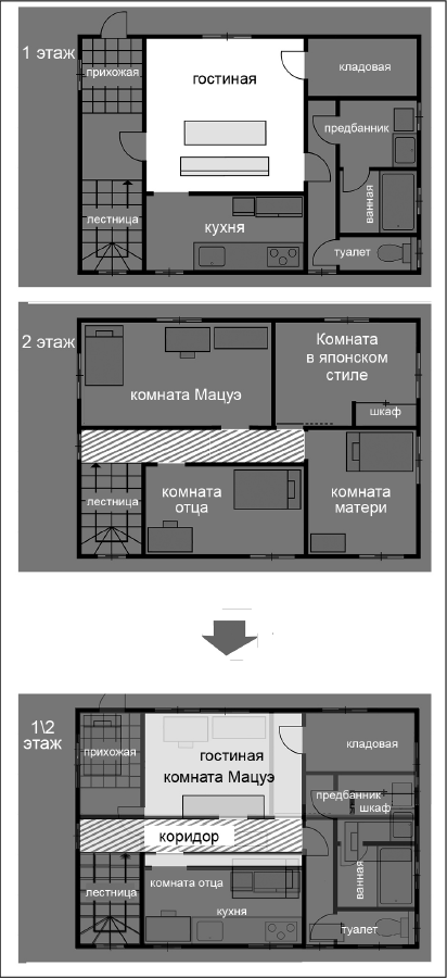 Господин Мацуэ достал из сумки блокнот и начал рисовать в нем шариковой ручкой. Похоже, это был план дома. Через пять минут план был готов, и он практически полностью совпадал с тем, что госпожа Касахара показывала мне недавно. Отличалось лишь расположение мебели, а сама планировка дома была полностью идентична.