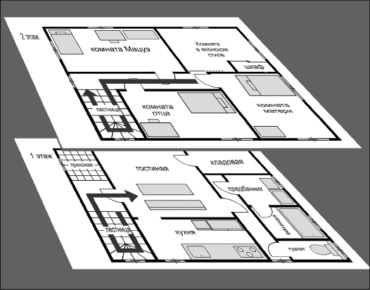 Как видно из плана дома, над гостиной проходил коридор второго этажа. Поэтому, когда кто-то из семьи ходил по коридору, я по звукам шагов мог понять, кто куда пошел. У отца и матери шаги звучали по-разному.