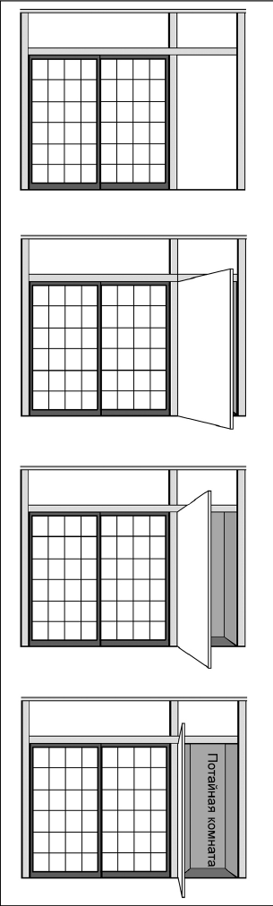 Автор: Судя по третьему пункту, ширина двери была равна ширине комнаты, то есть чуть меньше квадратного метра[79]. Но здесь возникает вопрос: каким образом дверь удавалось прятать?