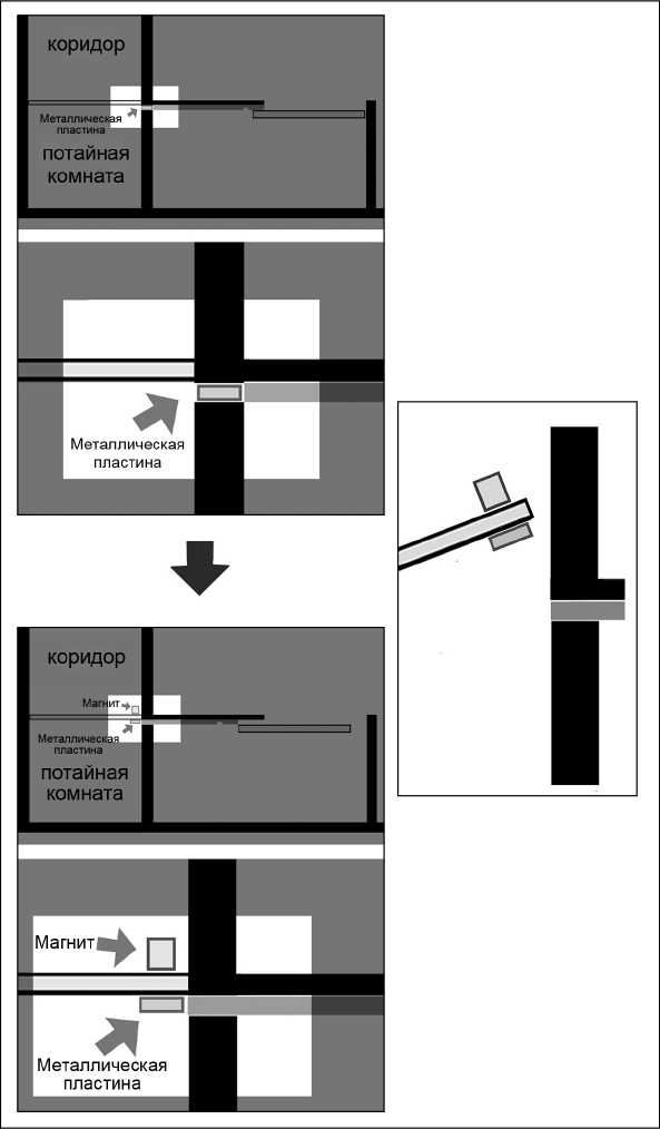 Вывод мой заключался в следующем. В стене между коридором и гостиной находилась металлическая пластина. При движении внутренней панели перегородки эта пластина выдвигалась в потайную комнату.