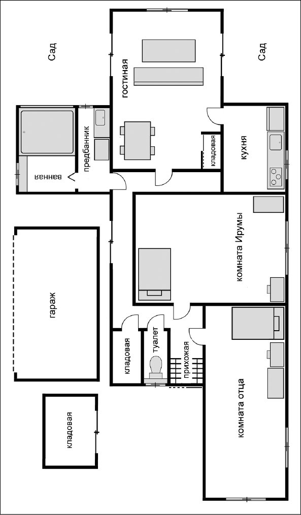 Было одиннадцать часов утра, отец Ирумы обычно возвращался примерно в восемь вечера – в запасе у нас имелось полно времени. Для начала мы решили, что Ирума проведет мне экскурсию по комнатам. В процессе в своем блокноте я делал простые наброски планировки.