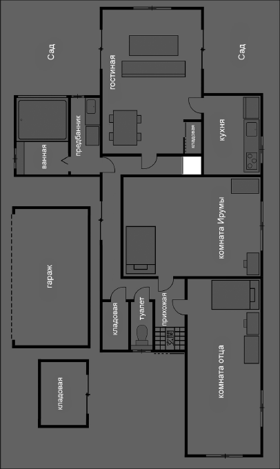 Из слов «из окна с противоположной стороны виднелись проезжающие туда-сюда машины» становится ясно, что одна сторона гостиной смотрела на дорогу. Именно в этой комнате Наруки с мамой и «дядей» ужинали – естественно, что мальчик называл ее «комната, где мы едим». Что касается соседней комнаты, вот как про нее рассказывает Наруки в своем дневнике: